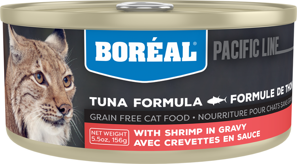 The main ingredient is red meat (dark muscle meat) tuna. The Boréal wet line is topped with chicken, shrimp, whitefish, carrots and peas in gravy. All cans contain over 95% meat and use low glycemic index ingredients, are grain free and byproduct free.