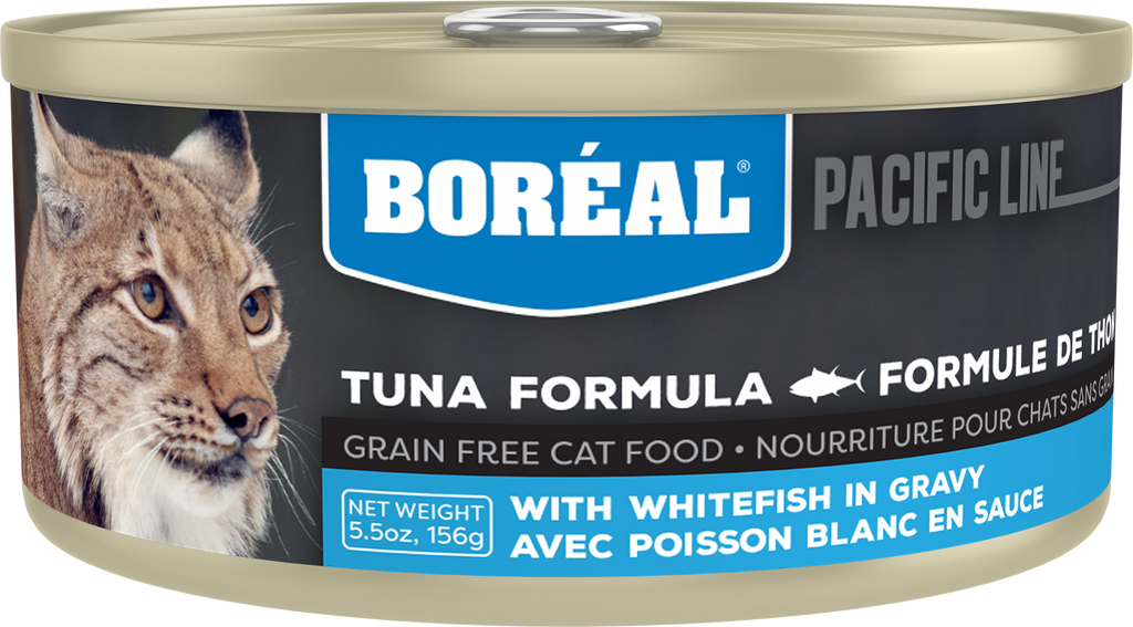 The main ingredient is red meat (dark muscle meat) tuna. The Boréal wet line is topped with chicken, shrimp, whitefish, carrots and peas in gravy. All cans contain over 95% meat and use low glycemic index ingredients, are grain free and byproduct free.